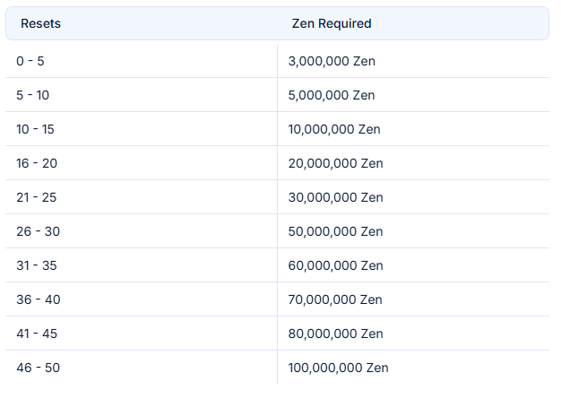 ๐ฐ Reset Zen Cost Table